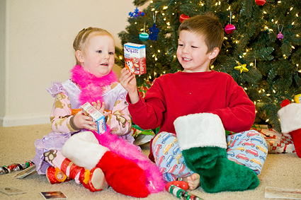 What is pine bologna doing in Brinley’s stocking? Drew looks perplexed. Probably because baloney is spelled bologna.